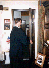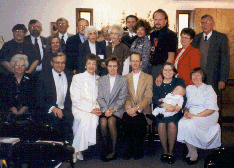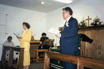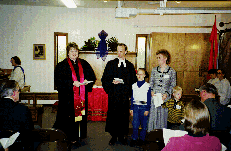 The dedicatory service proceeds for the Epworth Chapel, still in a home. Stan and Donna Crow do their parts, with Ann Barton as acolyte, and with Esther Wesche at the Conn organ.