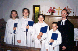 Epworth conducts its first induction of acolytes. From left to right are Ann Barton, Rebecca Nemnich, Freddy Nestor, Anthony Nestor, and Pastor Thelander.